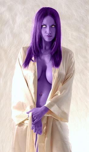 | Physical Description | At a statuesque height, Yolanthe towers over most of the population, and she's not above rubbing it in with heeled boots on top. Whilst almost human in shape and proportion, Yolanthe will never pass as human, since her skin changes colour with every shift in emotion. Normally a velvety violet, with hair a rich purple and indigo, her skin moves with her moods, through an enormous spectrum of hues and tones that indicate every emotion. She normally limits her wardrobe to loose fitting shirts and trousers in black or white; anything else results in an eye-watering clash between clothing and skin tone. |